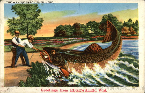 Front: THE WAY WE CATCH THEM HERE. Greetings from EDGEWATER, WIS. Back: 50 Post Care VES OFID ST. JUN FRANKLIN 1937 got here all right have not been out Williams Anny fisking yet, hadha Scaf Rain hice trip up hure illomi IN Charlia