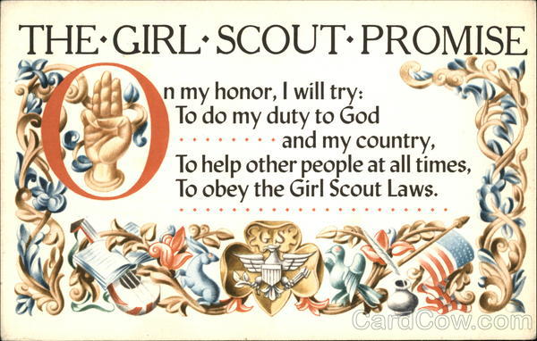 Front: THE GIRL SCOUT PROMISE n my honor, I will try: To do my duty to God and my country, To help other people at all times, To obey the Girl Scout Laws. Back: TRADE MARK GIRL ( S) SCOUT REGISTERED US. PATENT OFFICE