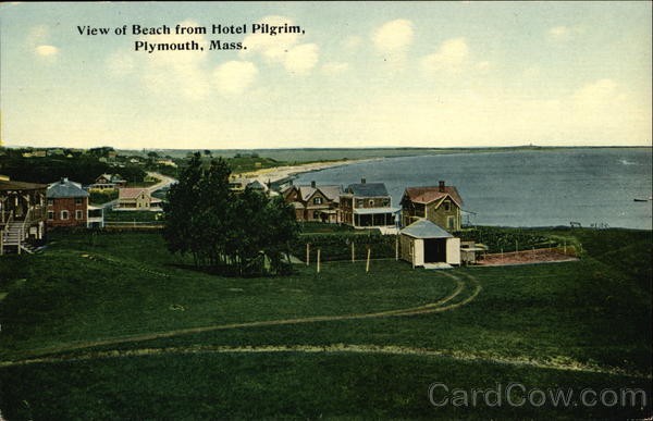 Front: View of Beach from Hotel Pilgrim, Plymouth, Mass. 00 SUM Back: Mfg. by Tichnor Bros. Inc., Boston, Mass. & Los Angeles, Cal heetr For Correspondence only OST ARD 50.