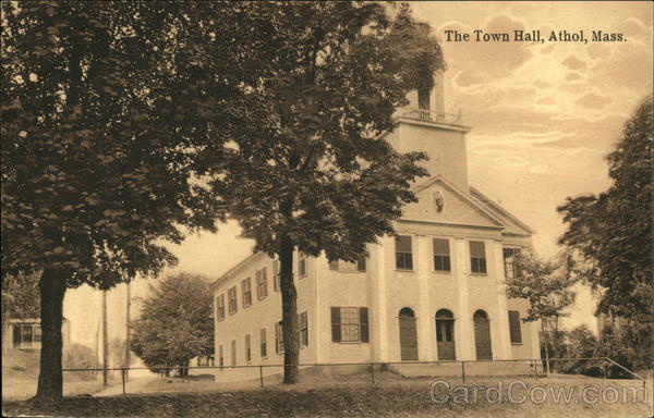 Front: 08-6 111 The Town Hall, Athol, Mass. Back: AA 5706 Pub. by Irving S. Purdy, Athol, Mass. TONE DOUBLE N. BERLIN LEIPZIG SEPIA DRESDEN United States, and Island Possessions, Cuba, Canada and ONE CENTS. For all other Countries Two CENTS.