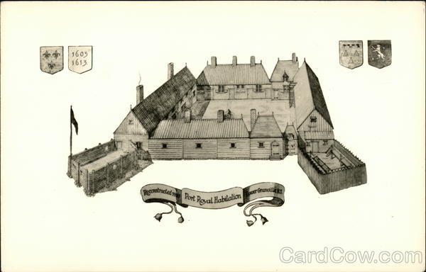 Front: Reconstructed 19 Port Royal Habitalion oaer Granvill NS 1605 1613. 匪用! 用用 出出 Back: KA SSTO WOTNYO NI OTVIN HORNS EOVA