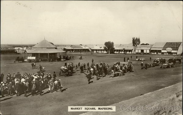 Front: DRAFER BUTFITTER HAISST BCLENNONAD FLAC JC SMIT MARKET SQUARE, MAFEKING. Back: 13 Published by E. Platnauer, Mafeking