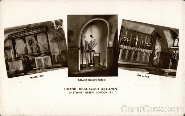 Front: THE ALTAR PRAYER DESK ROLAND PHILIPPS' SHRINE ROLAND HOUSE SCOUT SETTLEMENT 29 STEPNEY GREEN, LONDON, E.I. Back: It with only 5 WORDS OF GREETINGS GUARANTEED REAL PHOTOGRAPH With Greetings and Best Wishes