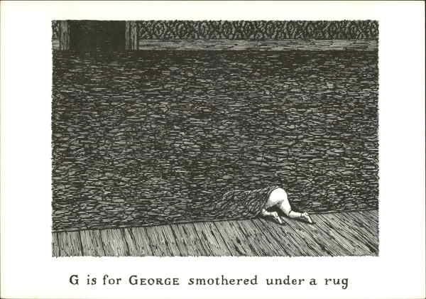 Front: G is for GEORGE smothered under a rug Back: Edward Gorey 1979 from: "THE GASHLY CRUMB TINIES" PCEG-24 Edward Gorey Published and distributed by Harvey Hutter & Co. Inc., N.Y., N.Y. Printed in USA