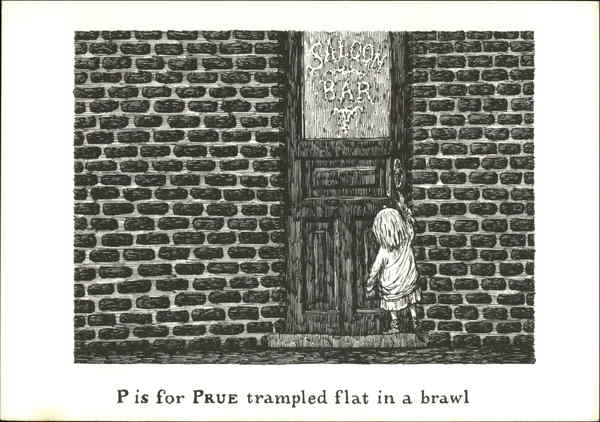 Front: BARK P is for PRUE trampled flat in a brawl I Back: Ⓒ Edward Gorey 1979 from: "THE GASHLY CRUMB TINIES" PCEG-33 Edward Gorey Published and distributed by Harvey Hutter & Co. Inc., N.Y., N.Y. Printed in USA