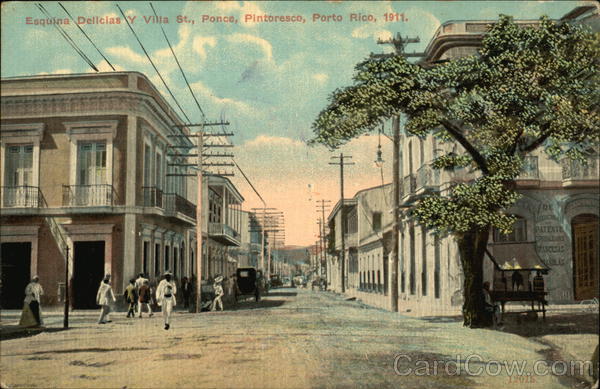 Front: Esquina Delicias Y Villa St., Ponce, Pintoresco, Porto Rico, 1911. TA/DE EDICINA PATENTE 12015 FRANCESAS RAÑOLAS GERO Back: Pub. by Otero & Sobrino, Ponce, Porto Rico. Twocents