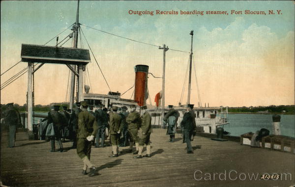 Front: Outgoing Recruits boarding steamer, Fort Slocum, N. Y. CICENDS STANLEYE 213615 Back: The Leighton & Valentine Co., N.Y. City. FAMOUS QUALITY this is the Dock yon Land on when you come here and whees you Leave. TRADE MARK. THE WORLD