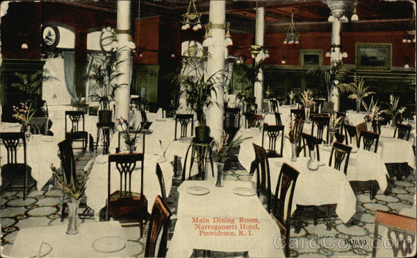 Front: Main Dining Room, Narragansett Hotel, Providence, R. I. MI7650 W Back: MIERA LEIPZIG BERLIN NEW YORK. PUBLISHED BY NARRAGANSETT HOTEL FLETCHER LAND CO., PROP. JOSEPH E. FLETCHER, PRES. PROVIDENCE, R. I. 4-1 TWO CENTS