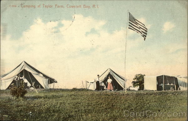 Front: 2729 c804 Camping at Taylor Farm, Cowesett Bay, R.I. Back: Published for E. E. Matteson, Apponaug, R. I. Jing TER CENTER 19 POST CARD.AM R.I. Ralph Nichol Foster Center R.I.