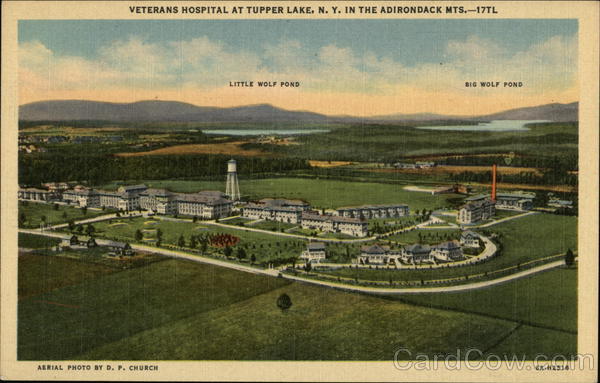 Front: VETERANS HOSPITAL AT TUPPER LAKE, N. Y. IN THE ADIRONDACK MTS.-17TL LITTLE WOLF POND BIG WOLF POND AERIAL PHOTO BY D. P. CHURCH 6A-H2518 331 Back: C. W. HUGHES & CO., INC., MECHANICVILLE, N. Y.