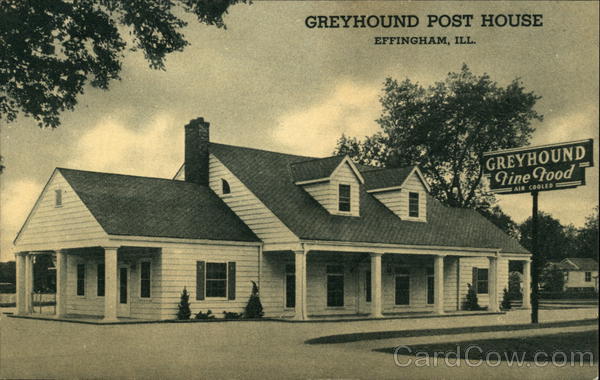 Front: GREYHOUND POST HOUSE EFFINGHAM, ILL. GREYHOUND Gine tood AIR COOLED Back: AL Greyhound Post House EFFINGHAM, ILL. “The Heart of the Nation" D-6378