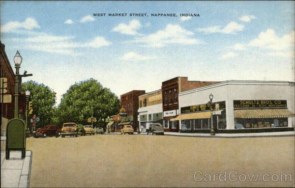 Front: WEST MARKET STREET, NAPPANEE, INDIANA SCHULTZ BROS. CO FEATURING 54 SLO0 MERCHANDISE SCHLTT ROS Back: со 81 3108N A “Natural Color Card” made by E. C. Kropp Co., Milwaukee, Wis.-JHF