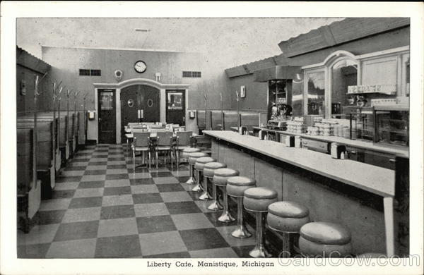 Front: Liberty Cafe, Manistique, Michigan Back: Liberty Cale Manistique's finest restaurant. Serving Manistique and Vacationists since 1917. Located across from the Post Office. 12- ETCHTONE Linderoth Photos, Manistique, Mich.