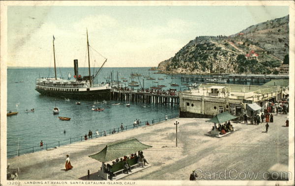 Front: 增功 13202 LANDING AT AVALON SANTA CATALINA ISLAND, CALIF. 好 Back: MADE ONLY BY DETROIT PUBLISHING CO. "PHOSTINT" CARD. TRADE MARK REG. U. S. PAT. OFF. THIS SPACE MAY BE USED FOR MESSAGE. AND CANADA. FOREIGN. TWO CENTS