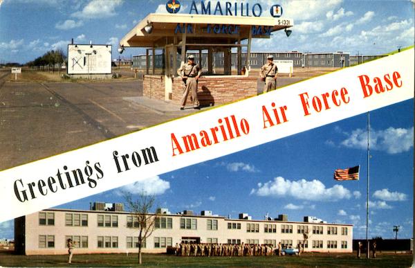 Top scene: Entrance to Amarillo Air Force Base. Amarillo./ Texas. Bottom scene: Headquarters building.