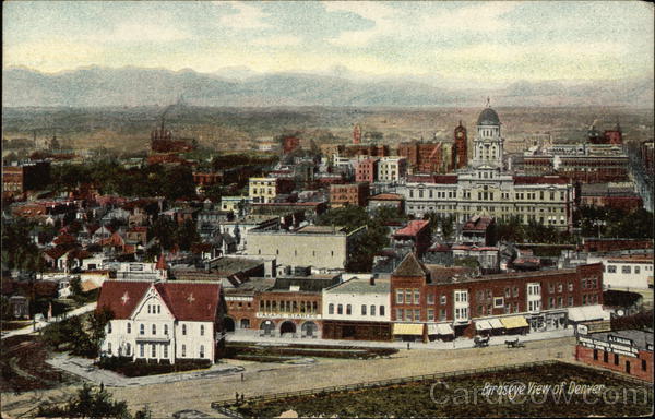 Front: FRAFFEEL 鼎出版 PALACE STABLES DE 微博 ATMLSOL BEWER CLADIES PRESSING CO. $32 FR 53 MONTHS. Birdseye View of Denver Back: 700 Rosin & Co., Phila & New-York. Made in Germany. Post Card- TWO CENTS