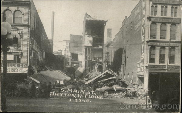 Front: (LER CO. SET BUSY S S. MAIN ST. DAYTON, Q.FLOOD. 3-27-13. Y CON 0.0 PARSUS.G $2-13 HATS HARY TYS Back: Published by Haenlein Bros., Columbus, Ohio. 67 FOREIGN, TWO CENTS
