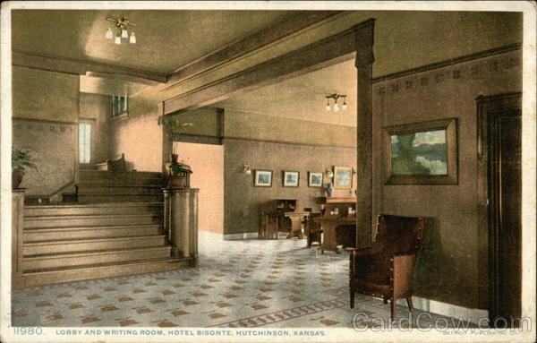 Front: 11980. DOOD ****** WAR LOBBY AND WRITING ROOM, HOTEL BISONTE, HUTCHINSON, KANSAS. ***** DETROIT PUBLISHING CO. Back: MADE ONLY BY DETROIT PUBLISHING CO. "PHOSTINT" CARD. THIS SPACE MAY BE USED FOR MESSAGE. 4/ AND CANADA. FOREIGN. TWO CENTS