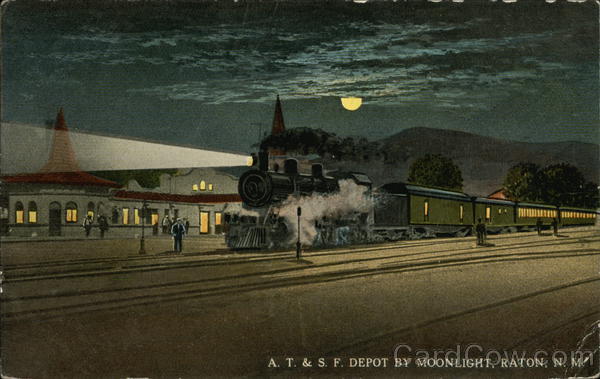 A. T. & S. F. DEPOT BY MOONLIGHT, RATON, N. M