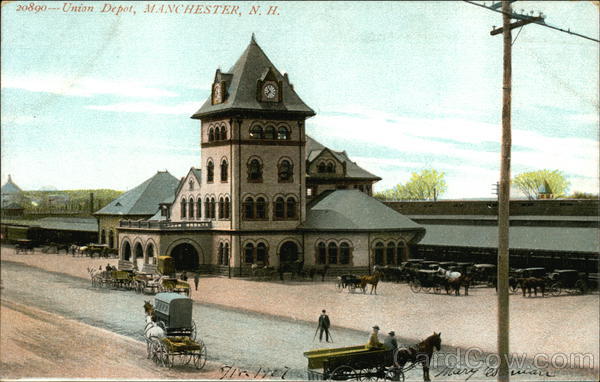 Front: 20890-- Union Depot, MANCHESTER, N. H. in . 食用 具 P 100 資訊部 **** **** Mary es ef wan Back: Souvenir Post Card Co., New York Printed in Germany. TWO CENTS