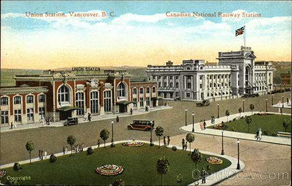 Front: Union Station, Vancouver, B. C. Copyright UNION STATION 16 Canadian National Railway Station. TE O 44 Back: MADE IN USA PUBLISHED BY THE COAST PUBLISHING CO., VANCOUVER, B. C. 106529 POSTAGE