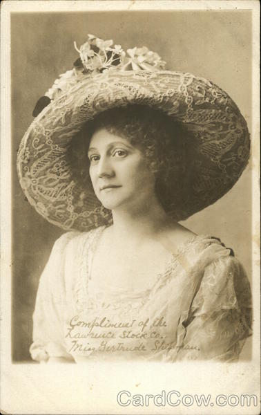 Front: Compliment of the Kawrence Stock Co.. Min Gertrude Shifpan. www Back: REPRO PHOTO CO., 259 WEST 42nd ST., N. Y. CITY. A AZOA = STAMP = 4N04 AAZ OA NAME AND ADDRESS HERE