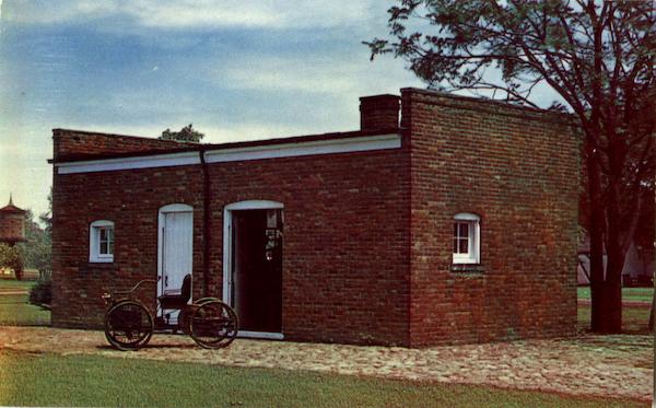 This red brick shed, formerly located at 58 Bagley Avenue in Detroit, is the birthplace of the First Ford Car. Here, in 1896, Henry Ford constructed his historic car. This shed has been preserved for posterity in scenic Greenfield Village, a group of 92 historical buildings and landmarks, founded by Henry Ford and located in Dearborn, Michigan. Greenfield Village is open to the public the year around. |
