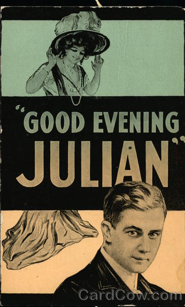 Front: GOOD EVENING JULIAN >) Back: Pub. by Kraus Mfg. Co., New York City. K. 288. A. H. WOODS Presents JULIAN ELTINGE In "The Fascinating Widow. Week November 6th. oBroadway Theatre, Brooklyn, N Y. This side for address only.