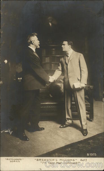 Front: staltry. "ROTOGRAPH ** "BREWSTER'S MILLIONS "I'll take that contract!" Act I B 1975 Back: psl THIS SPACE MAY BE USED FOR WRITING THIS CARD IS A REAL PHOTOGRAPH ON BROMIDE PAPER THE ROTOGRAPH Co., M.Y. CITY TWO CENTS