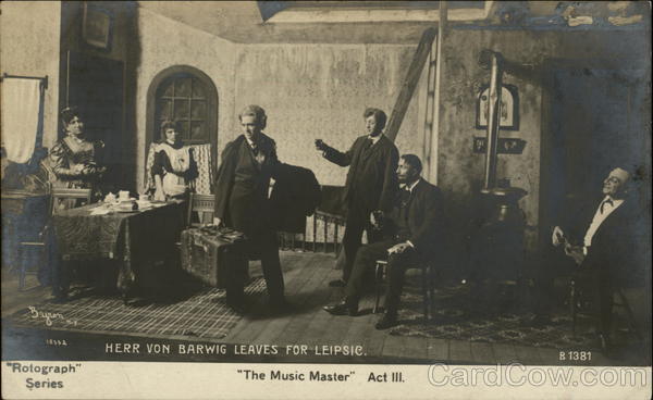 Front: Bryron 18552 "Rotograph" IT HERR VON BARWIG LEAVES FOR LEIPSIC. "The Music Master" Act III. B 1381 Back: THE ROTOGRAPH CO., N. Y. CITY. DOMEST C ONE GENT TWO CENTS.