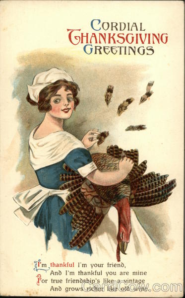 Front: CORDIAL THANKSGIVING GREETINGS I'm thankful I'm your friend, And I'm thankful you are mine For true friendship's like a vintage And grows richer like old wine. Back: Nov. 25.1917. id 10 in Alice Jaquith ON THIS SIDE. TWO CENTS