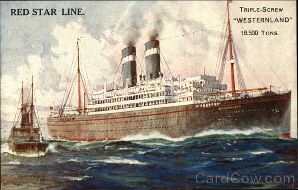 Front: RED STAR LINE. GISKE ************** ******* ********* SCHRECKS Les maru* NO GARIDAN ***** TRIPLE-SCREW "WESTERNLAND" 16.500 TONS. WESTERNLAND Back: CARTE POSTALE. POSTKARTE. TO NEW YORK & CANADA= =