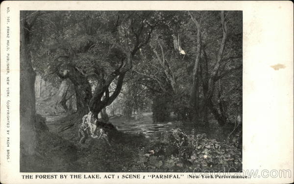 Front: NO. 101. FRANZ HULD, PUBLISHER, NEW YORK. (COPYRIGHTED BY PACH BROS.) THE FOREST BY THE LAKE, ACT 1 SCENE I "PARSIFAL" (New York Performance.) Back: - Post Gard (POSTAL CARD-CARTE POSTALE) TO FOREIGN COUNTRIES TWO CENTS