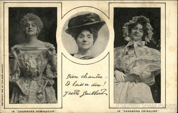 Front: COPYRIGHT 1900 BY THE ROSE COMPANY IN "CHANSONS POMPADOUR" Bien chanter Et laisser dire! grette Guilbert IN "CHANSONS CRINOLINE" Back: Histrionic Series-Pub. by The Rose Company, Phila., Pa. MAIL CARD a. -P Here