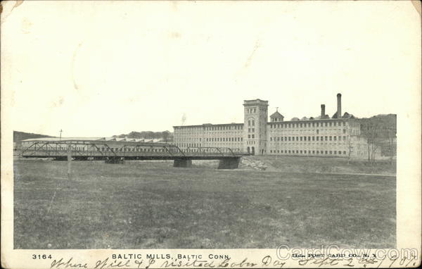 Front: www.atv.dm. Nu hubuntil INTINDO LIVNININ 11 3164 111 BALTIC MILLS, BALTIC CONN. ILL. POST CARD CO., N. Where spice Disited Dober Day Sept 22/907. Back: 450 DOMESTIC AND Two CENTS
