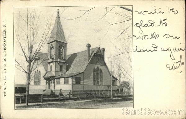 Front: TRINITY M. E. CHURCH, PENNSVILLE, N. J. ху грите что дваблю twalk on вондадат ейств Back: ESTCHES GI Post Card: 19 07 PA NSVI Z113 2PM D 1907 N. ST. M. Miss Stattie P. Manly Chuston So Hoskatal testchester Pa.
