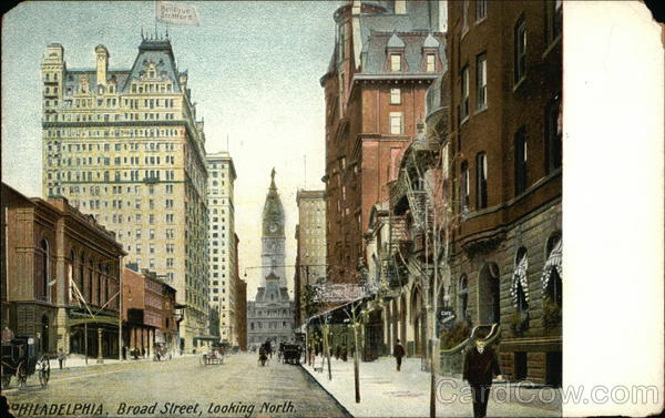 Front: Ta TER Bellevue Stratford WEE! PHILADELPHIA. Broad Street, Looking North. STREET TOLSTRE CAFE STENTON Back: (PRINTED IN GERMANY.) NO 617 UNITED ART PUBLISHING CO Two cents