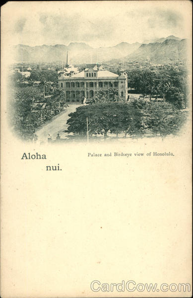 Palace and Birdseye view of Honolulu Aloha nui. Card Cow.com