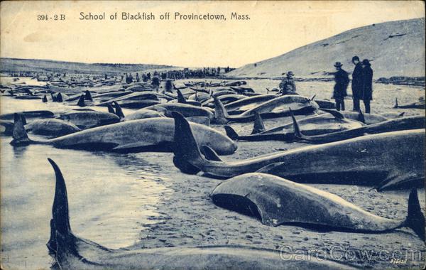 Front: 39.2 B School of Blackfish off Provincetown, Mass. Cacic Back: l'ace Stamp here le Published by Blanchard, Young & Co. Providence, R. I, U, S. A. and Germany,