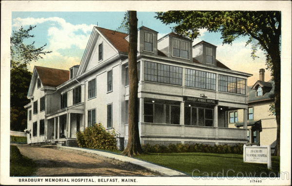 Front: BRADBURY MEMORIAL HOSPITAL, BELFAST, MAINE. BRADBORY MEMORIAL HOSPITAL BRADBURY MEMORIAL HOSPITAL WW 117460 Back: C. T. AMERICAN ART COLORED TE CHI AGO BORATOR RED SENT CENT