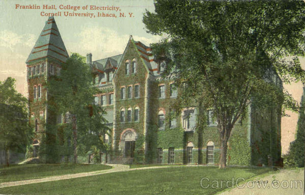 Front: Franklin Hall, College of Electricity, Cornell University, Ithaca, N. Y. 000 204559 Back: The Leighton & Valentine Co., N.Y. City. THROUGHOUT FAMOUS QUALITY 73 THE WORLD TRADE MARK. Alre Martin Rajmain Sthan er