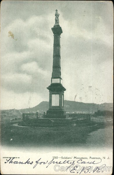 Front: SOUVENIR POST CARD CO AL Thanks for pretty ( 3302-Soldiers' Monument, Paterson, N J. E.13.12. Back: HOLLY 908 fr MPA THIS S.DE FOR THE ADDRESS is L. 1:06 FRANKLIN 1790 NITED STATES OF NTIL Shreve M.A.R. 1617 Brown St Philadefplice رجمه مه a