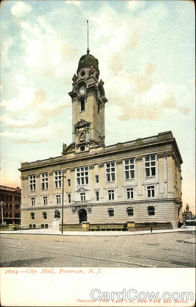 Front: ********** 7-7-7 11 11 i 2604-City Hall, Paterson, N. J. Souvenir Post Card Co., New York and Berlin. Back: XR & poen رمحال TWO CENTS