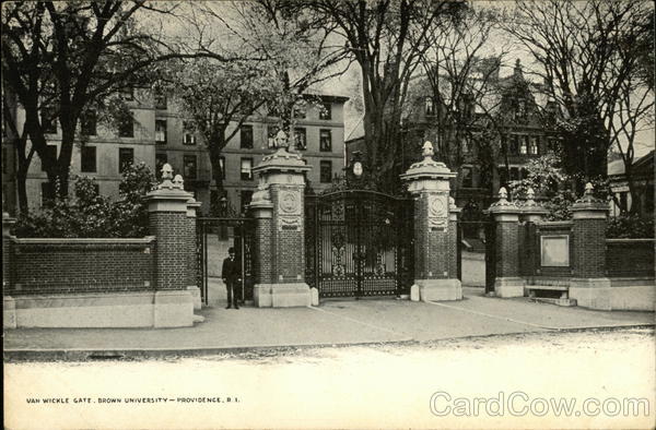 Front: VAN WICKLE GATE. BROWN UNIVERSITY PROVIDENCE, R.I. 100 Back: [Stamp here] Domestic, 1c. Foreign, 2c.