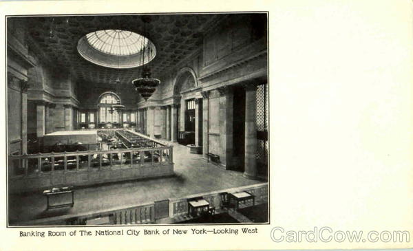 Front: Banking Room of The National City Bank of New York-Looking West Back: MOLTON PRINTING CO, BROOKLYN Canada, Cuba Mexico, Hawaii Philippines Porto Rico Foreign, 2c. NYC 20 180