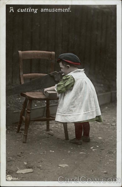 Front: A cutting amusement. 1352. Back: ARISTOPHOT Co. LTD. LONDON.W.C. To Little from Georgy REAL PHOTO ARISTOPHOT SERIES. Mr Mrs Harrison