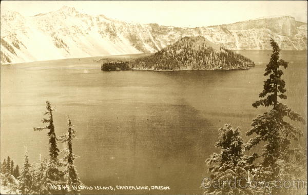 Front: NO349 WIZARD ISLAND, CRATER LAKE, OREGON, Back: PUBLISHED BY PACIFIC PHOTO CO. SALEM, OREGON. AAN A