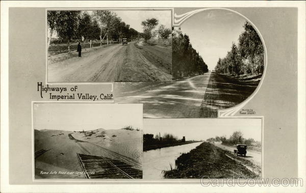 Front: Highways of Imperial Valley, Calif. Yuma Auto Road over Sand Dunes Photos by EVAN LAVIS Back: 25- ΔΑΖΟ. = STAMP = HERE O VAZOV 101