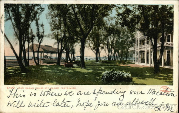 Front: 6400 STAR ISLAND HOUSE. STE. CLAIRE FLATS. MICH. spending is where we are will wilt later, hope you our Vacation all well L.M Back: Mr. J. Martin Вигота Bot 113 youm DETROT Connecticut IES 1902 ESOF 1703 FRANKLIN 190 96 ONE CENT