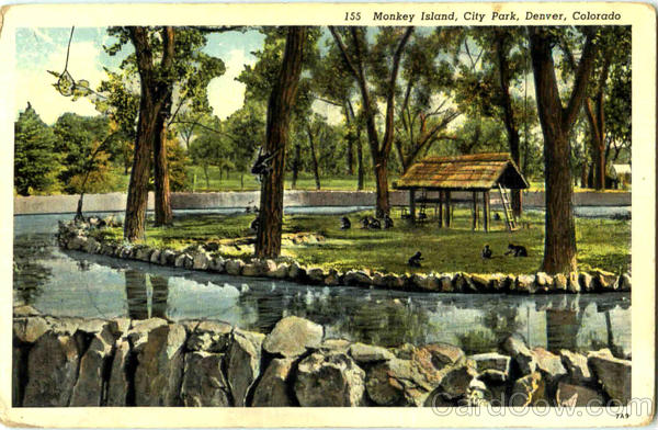 | Monkey Island is one of the most unique features in Denver's great City Park. Here the monkeys can climb or frolic or snooze as freely as they wish. A tunnel connects the island with regular quarters where the monkeys may retreat in bad weather |